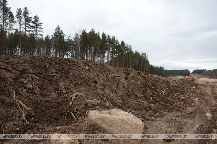 "Подготовительные работы на этом участке начались летом прошлого года. Прежде всего предстояло произвести вырубку деревьев в прилегающем лесном массиве. Если говорить конкретно об участке, где задействован наш трест, то с этой территории было вывезено около 56 тыс. деревьев. Затем выполнялась выкорчевка пней, уборка веток, которые пойдут на щепу: ее мы используем для рекультивации карьера, специально открытого в непосредственной близости от объекта для добычи необходимых материалов. Так, только для устройства насыпи из карьера будет вывезено более 1 млн т грунта", - рассказал производитель работ ОАО "СМТ №8" Владимир Миронович.