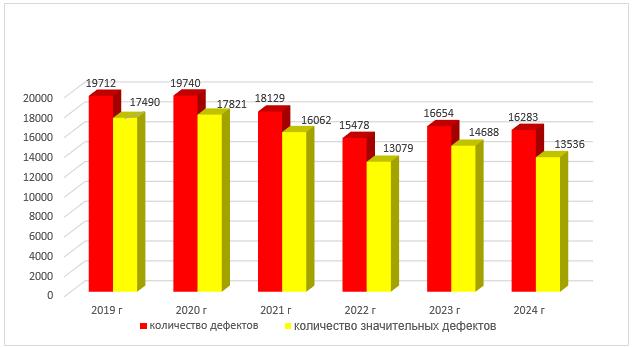 Рисунок 1. График снижения количества выявленных дефектов за 2019-2024 после внедрения ГОСТ ISO/IEC 17020-2013