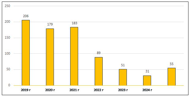 На рисунке 2 приведены данные о количестве выданных мотивированных отказов специализированной инспекцией Госстройнадзора за 2019–2024 годы. За указанный период их число сократилось на 25% , что объясняется унификацией критериев оценки и повышением квалификации инспекторов.