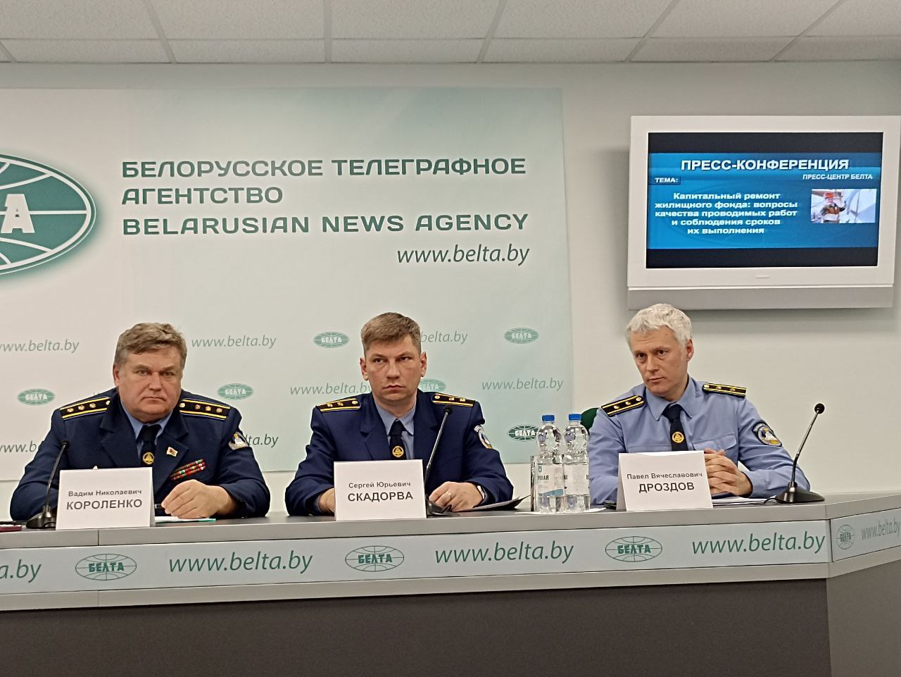 В пресс-центре БЕЛТА состоялась пресс-конференция, посвящённая актуальным вопросам капитального ремонта жилищного фонда. В центре внимания – качество проводимых работ и соблюдение сроков их выполнения, темы, которые волнуют тысячи жителей многоквартирных домов по всей стране. Участие в мероприятии приняли заместитель директора Департамента контроля и надзора за строительством Госстандарта Вадим Короленко, первый заместитель начальника инспекции Госстройнадзора по Минской области Сергей Скадорва и заместитель начальника инспекции Госстройнадзора по городу Минску Павел Дроздов.