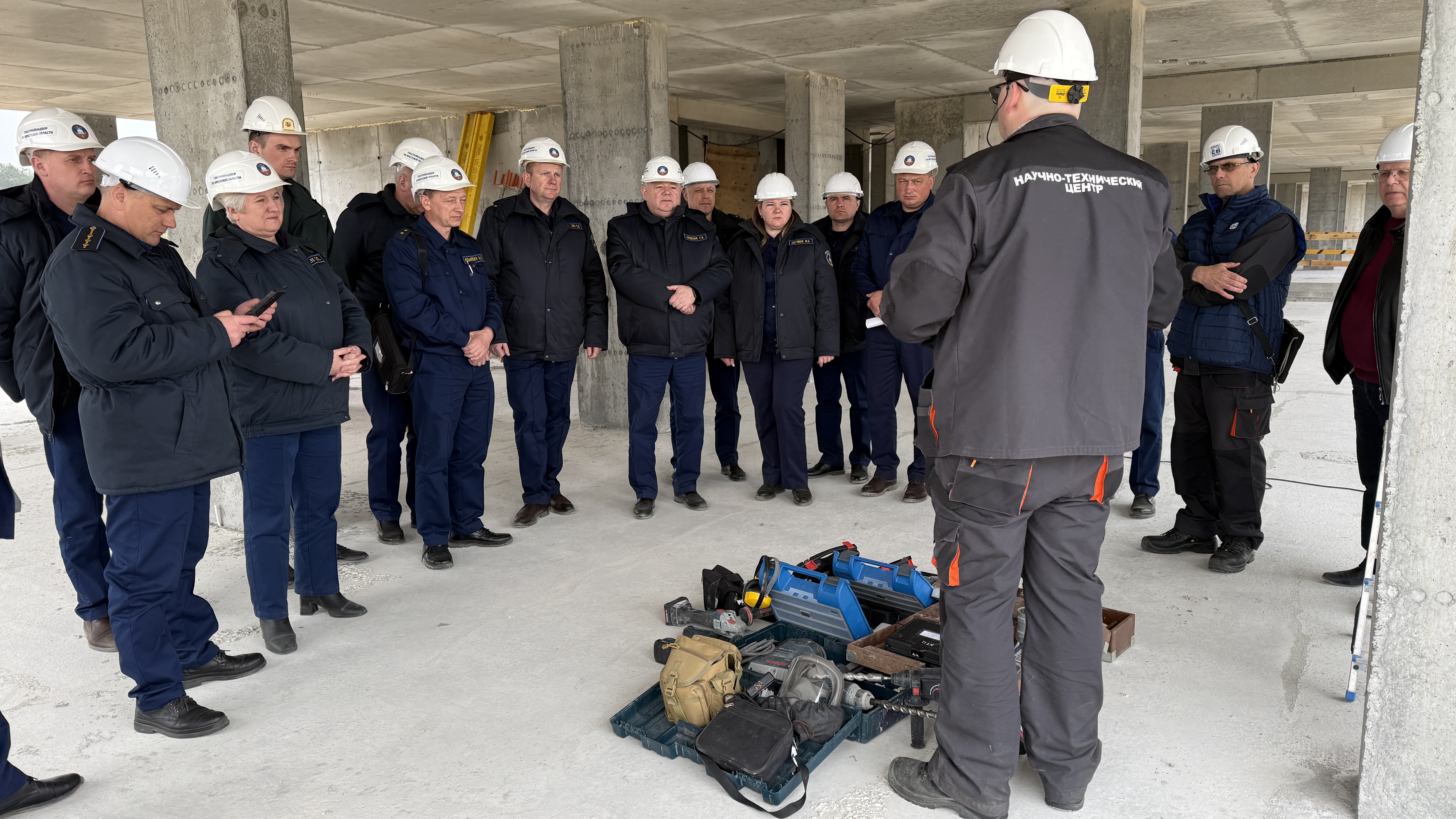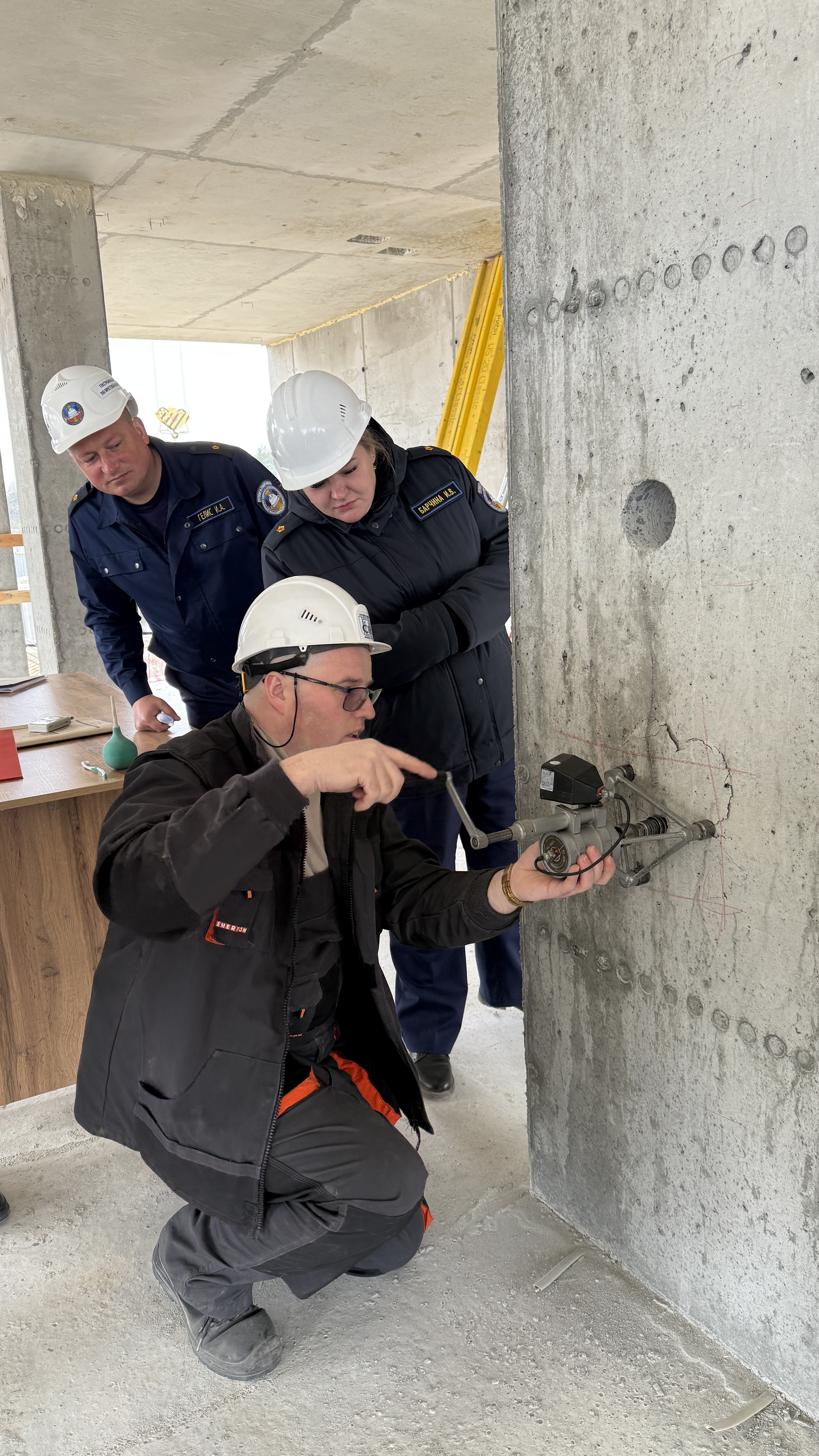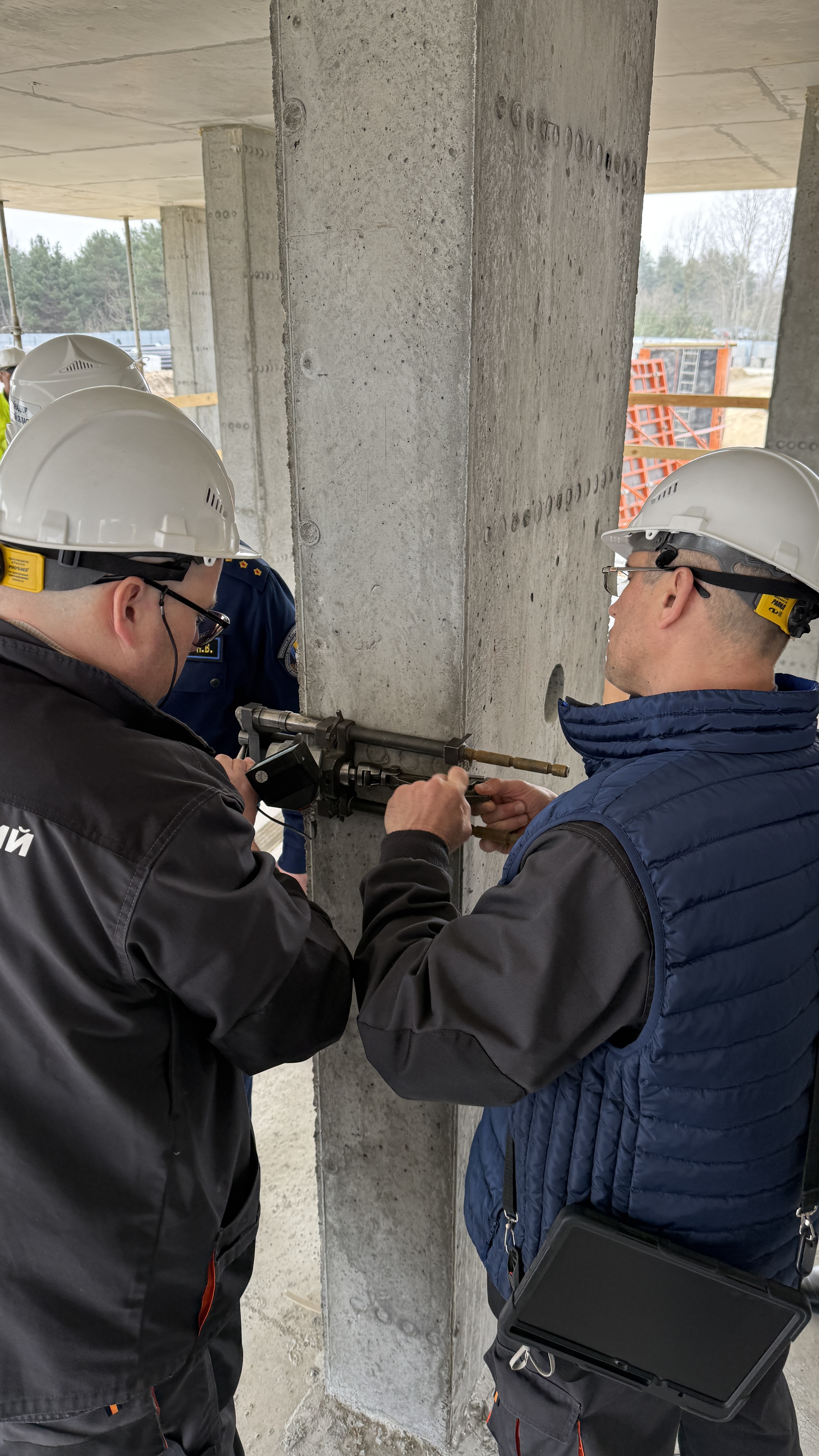 Инспекторам были продемонстрированы практические навыки по испытанию прочности бетона следующими способами: ударно-импульсный метод, метод вырыва, метод скола ребра, а также выпиливание цилиндров для испытания разрушающим методом на сжатие. Каждый из этих способов позволяет оценить качество материала без разрушения конструкции или с минимальным вмешательством.